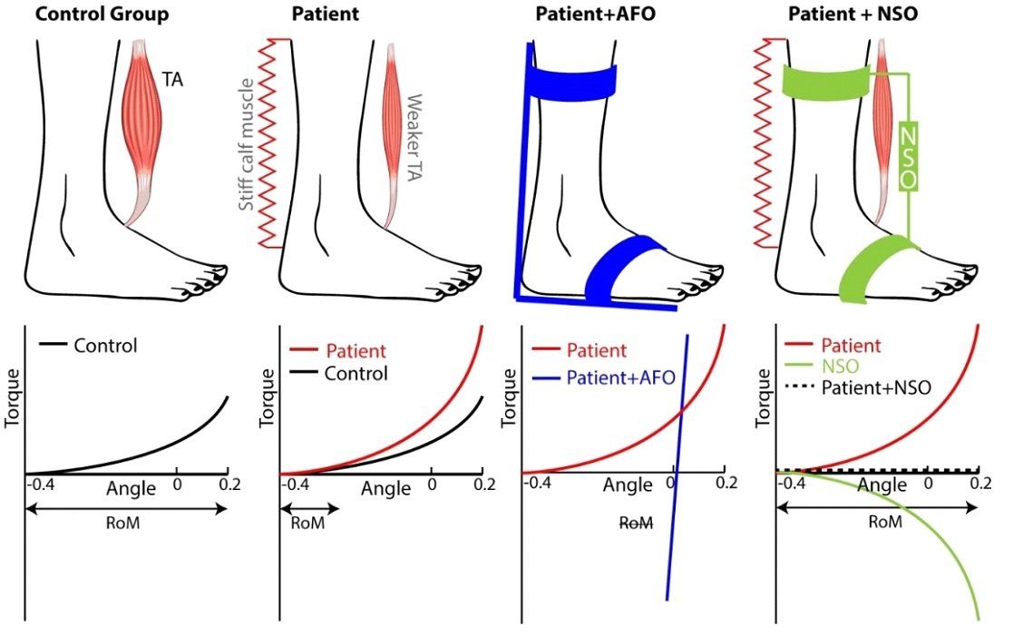 The approach for the Negative Stiffness Orthosis is to compensate the increased passive stiffness of the ankle with a negative stiffness. The Negative Stiffness Orthosis(NSO) was designed, built and evaluated. Magnetic neodymium was used to generate a compensating torque-angle relation for patients with a passive ankle stiffness classified as Ashworth 2.